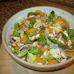 This spectacular salad features red leaf lettuce tossed with sugared almonds, mandarin orange segments and red onions, and topped with a sweet and tangy vinaigrette.