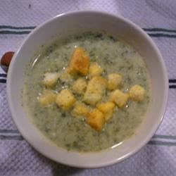Frozen spinach and bleu cheese are pureed in this cream and chicken broth based soup served hot with crisp crumbled bacon, or cold with a squeeze of fresh lemon juice.
